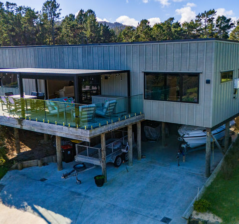 Four bed rooms two bath rooms. With large central living area flowing to large covered deck. With two bed rooms and a bathroom being either side of the spacious central living. Quality of chattels has not been spared. The quality and high standard of the home in no way looses the very relaxing ambience, making it very much homely. More than enough room to have friends and family over for the usual summer time entertainment. Decking front and rear of the home enables some very private family time in an amazing backyard setting. Pretty much think your in a magazine photo setting here. Walking across the back section to a lovely private setting of a cabin, another deck, with an amazing backdrop of some two dozen fruit trees with the sound of the river on the boundary. You look out to the harbour from the front of the home and bush / rural views of bush to the rear. Magical. Simply magical. Under the home is loads of concrete space for boat, car, trailer and garden sheds.